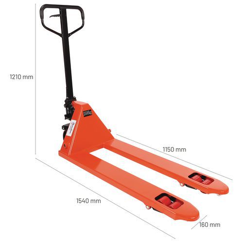Manutan Expert pallyftare, 2500 kg / 1150 mm - Robust pallyftare med underhållsfritt chassi i höghållfast stål, särskilt utformad för hantering av europeiska standardpallar (800 × 1200 mm).
