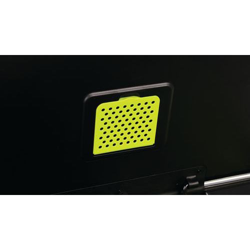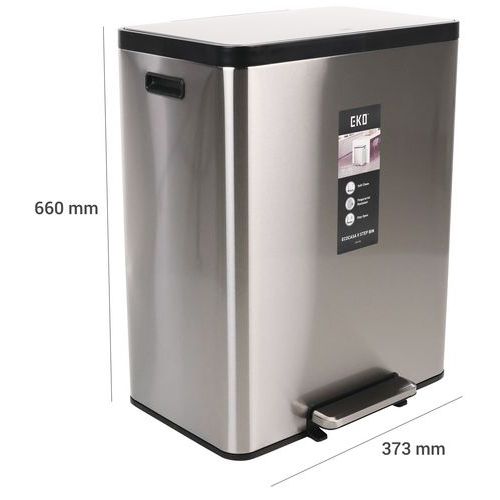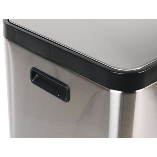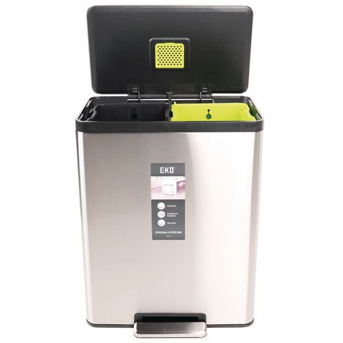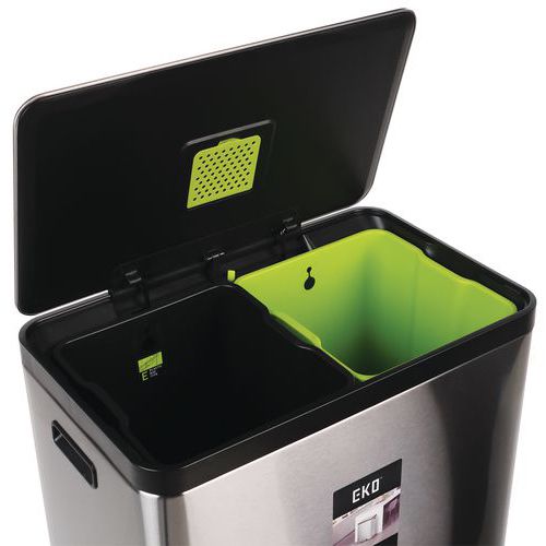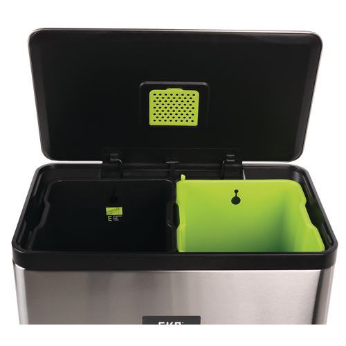 Utrustad med mjukstängande lock med inbyggt luktfilter och två innerkärl i plast (2 x 30 liter) för avfallssortering.