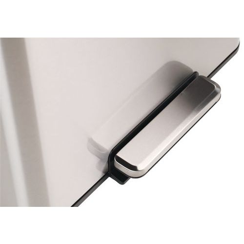 Rektangulär pedalbehållare av borstat rostfritt stål med fingeravtryckssäker beläggning och praktiska plasthandtag.