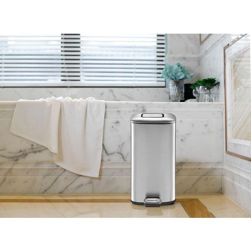 Fyrkantig soptunna med pedal, tillverkad av borstat rostfritt stål med anti-fingeravtrycksfinish.
