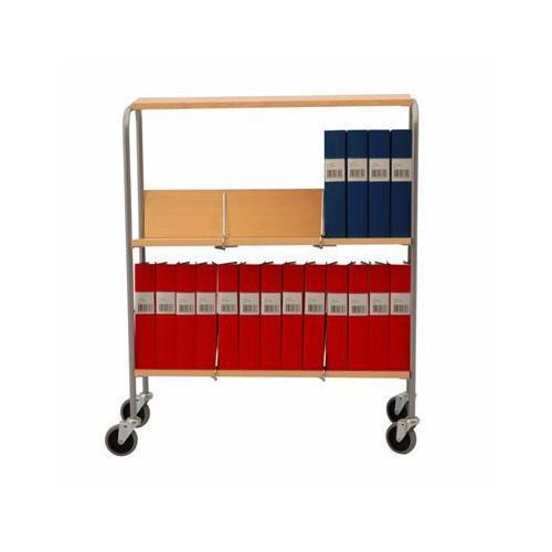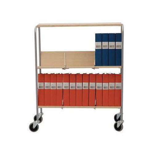 - Vagn i två storlekar med två snedställda hyllplan för förvaring och transport av ca 24 pärmar.