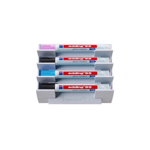 - Magnetisk pennhållare för glastavlor, utformad för att hålla upp till fyra whiteboardpennor inom räckhåll.