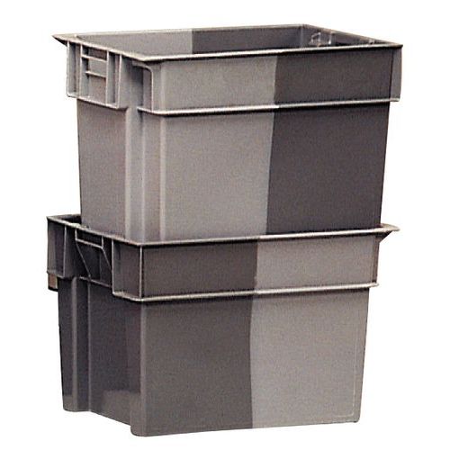 Stapelbara till 60 % för att spara plats. Bekväm hantering med breda ergonomiska handtag. Slät botten gör att den är kompatibel med alla typer av transportband. Tvåfärgad struktur gör den enkel att stapla.