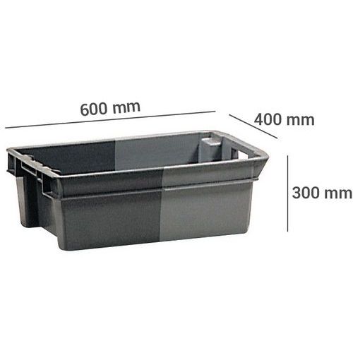 Stapelbara till 60 % för att spara plats. Bekväm hantering med breda ergonomiska handtag. Slät botten gör att den är kompatibel med alla typer av transportband. Tvåfärgad struktur gör den enkel att stapla. Tillverkad i EU Maximal last (kg) : 30 kg Kök