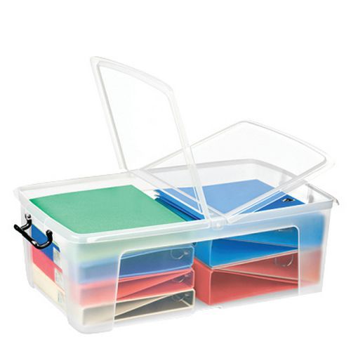 Förvaringslåda för dokument eller material. 2 kraftiga klämhandtag för effektiv förslutning. Mycket robust konstruktion med 4 hela förstärkta sidor. Stapelbar och stabil. Avsmalnad stapelbar form. Gjord i UK Garanti : 5 år