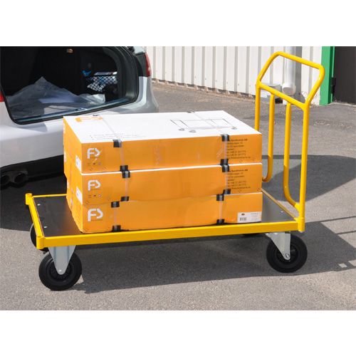 Gullackerad plattformsvagn i robust konstruktion med slitstark laminatskiva. Byglar i 25 mm stålrör och vinklat handtag. Fyra hjul, varav två länkhjul – enkel och köra runt. Maxbelastning på 400 kg – mångsidig plattformsvagn för de flesta sorters jobb. Levereras omonterad.