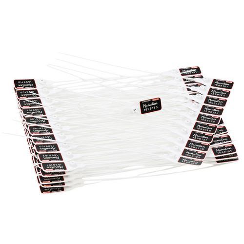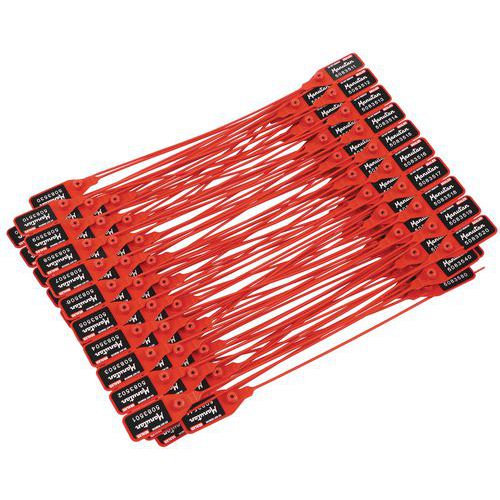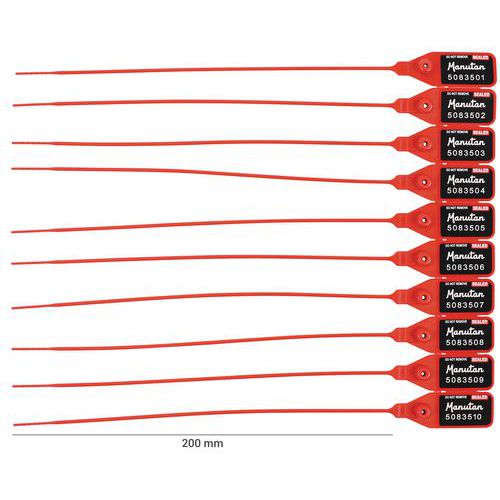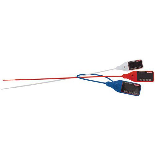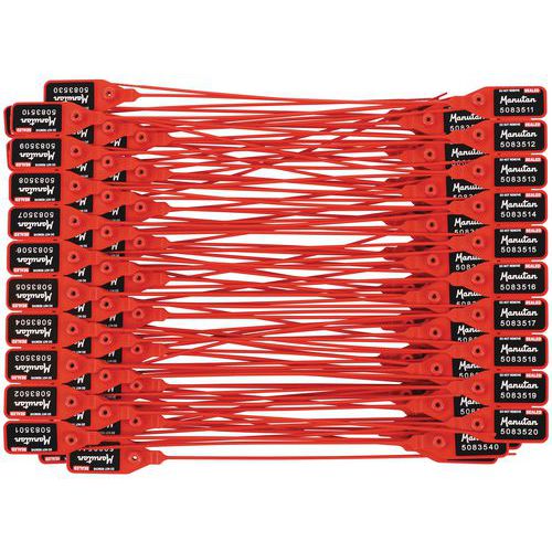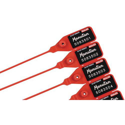 Plombering med låsmekanism i metall. Tål temperaturer mellan -30 °C och +40 °C. Utrustad med identifieringsnummer. Förslutning med platt band. Tillverkad i EU Garanti : 10 år