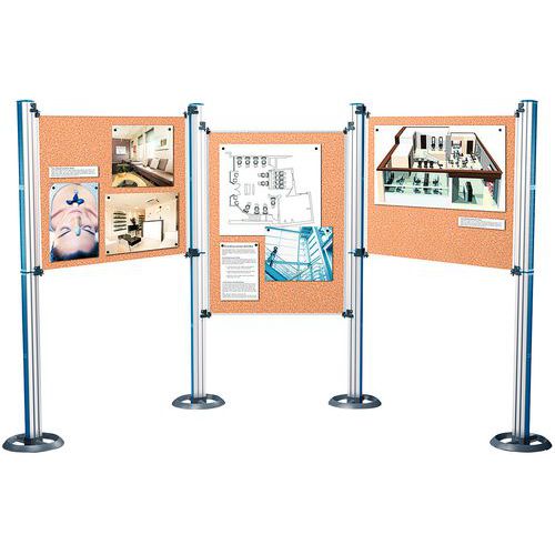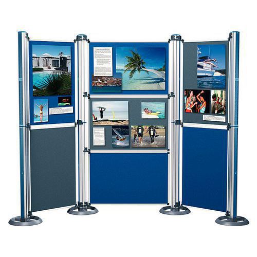Ändra dina presentationer snabbt och enkelt - utan verktyg. En monteringssats medföljer varje anslagstavla. Praktiskt presentationssystem som formar sig efter dina önskemål. Beställ så många stolpar och paneler som du behöver, och lägg till dem när du behöver. Brandsäkert material. Kan användas med häftstift. Stativ ingår inte. Glöm inte att beställa stativ till din presentationskärm!