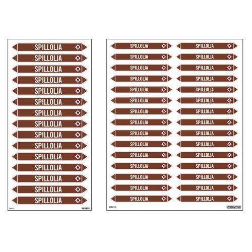 - Dekaler på ark, med text SPILLOLJA och symbol för brandfarligt.