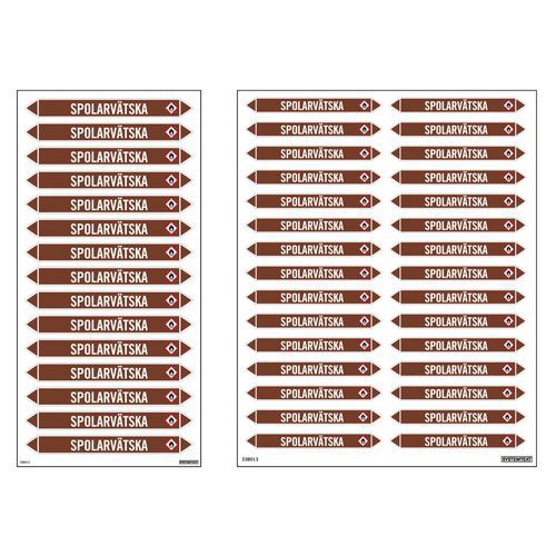 - Dekaler på ark, med text SPOLARVÄTSKA och symbol för brandfarligt.