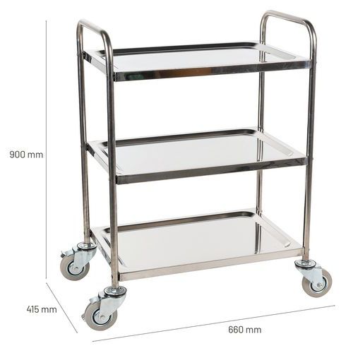 | Varunamn | Rostfri vagn, Kapacitet: 100 kg, Total höjd: 900 mm, Total bredd: 415 mm, Längd totalt: 660 mm |
