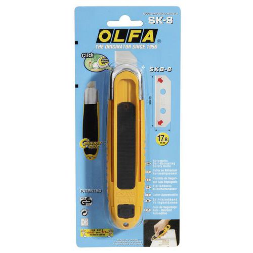 | Varunamn | Säkerhetkniv Olfa SK8, Indragbart blad: ja, Färg: Gul, Kök: nej, Hus, material: Plast, Blad, längd: 54 mm |