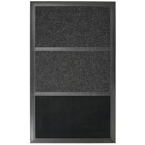 Matta tillverkad i 100 % naturgummi. Total tjocklek: 19 mm. Rymmer upp till 4,5 liter desinfektionslösning. Inbyggd fasad kant för att förhindra att medarbetare snubblar. Patenterad design för integrerad desinfektionsmatta och torkmatta. Denna matta rengör, desinficerar och torkar skor.