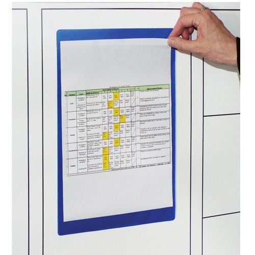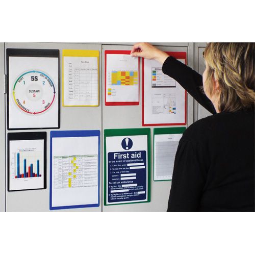 Färgade dokumentfickor i industriell kvalitet. Finns i storlekar för A4 och A5-dokument i stående eller liggande format. Går snabbt och enkelt att använda eftersom man inte behöver ta bort eller lyfta fickan för att byta ut insatsen. Självhäftande fickor ger permanent fastsättning. Få din display och viktig information att sticka ut med dessa färgade dokumentfickor. Fickorna kan fås i 5 olika färger och hjälper dig att förvandla enkla anslagstavlor till ett informationscentrum man lägger märke till, perfekt för 5S- och LEAN-ledningssystem.