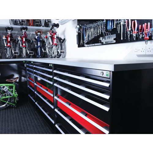 Förstärkningsfästen för ökad styvhet, tillåten belastning: 1 ton. Standardlådor för belastningar på 75 kg. Lagermonterade med 100 % teleskopisk utdragbarhet (total öppning). Ergonomiska handtag som möjliggör handpassage uppifrån eller underifrån, lådlåsningssystem som standard, individuell lådlåsning finns som tillval. Säkerhetsråd: installera möbeln på en plan yta, fäst den på en vägg eller skiljevägg med lämpliga fästelement, var noga med att inte överskrida den maximala rekommenderade belastningen och se till att den är väl fördelad.