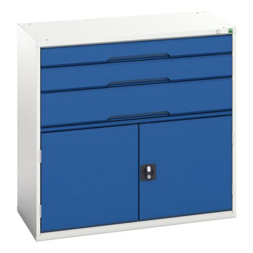 Kombinerat skåp tillverkat av svetsad stålplåt med förstärkningar för användning i industriella miljöer. Lådor monterade på rullskenor som klarar en belastning på 60 kg. Enkel öppning och stängning, även vid full last. Lådor stängs med centrallås. Enkelt djup på 550 mm. Säkerhetsråd: installera möbeln på en plan yta, fäst den på en vägg eller skiljevägg med lämpliga fästelement, var noga med att inte överskrida den maximala rekommenderade belastningen och se till att den är väl fördelad. Tillverkad i Storbritannien Maximal vikt per hyllplan (kg) : 75 Maximal last (kg) : 1000