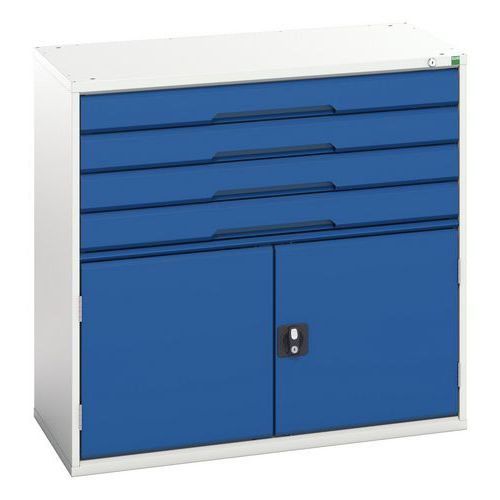 Kombinerat skåp tillverkat av svetsad stålplåt med förstärkningar för användning i industriella miljöer. Lådor monterade på rullskenor som klarar en belastning på 60 kg. Enkel öppning och stängning, även vid full last. Lådor stängs med centrallås. Enkelt djup på 550 mm. Säkerhetsråd: installera möbeln på en plan yta, fäst den på en vägg eller skiljevägg med lämpliga fästelement, var noga med att inte överskrida den maximala rekommenderade belastningen och se till att den är väl fördelad.