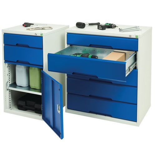 Kombinerat skåp tillverkat av svetsad stålplåt med förstärkningar för användning i industriella miljöer. Lådor monterade på rullskenor som klarar en belastning på 60 kg. Enkel öppning och stängning, även vid full last. Lådor stängs med centrallås. Enkelt djup på 550 mm. Säkerhetsråd: installera möbeln på en plan yta, fäst den på en vägg eller skiljevägg med lämpliga fästelement, var noga med att inte överskrida den maximala rekommenderade belastningen och se till att den är väl fördelad. Gjord i UK Maximal last (kg) : 1000 Maximal vikt per hyllplan (kg) : 75