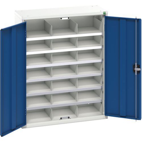 Låsbart skåp i stålplåt med fack. Idealisk för post, dokumentförvaring, lager etc. Fack med måtten LxBxH 235x310x100 mm. Förstärkta dörrar, 3-punktslås med regel. Bärförmåga 60 kg per hyllplan. Tillverkad i Storbritannien Maximal vikt per hyllplan (kg) : 75 Maximal last (kg) : 1000