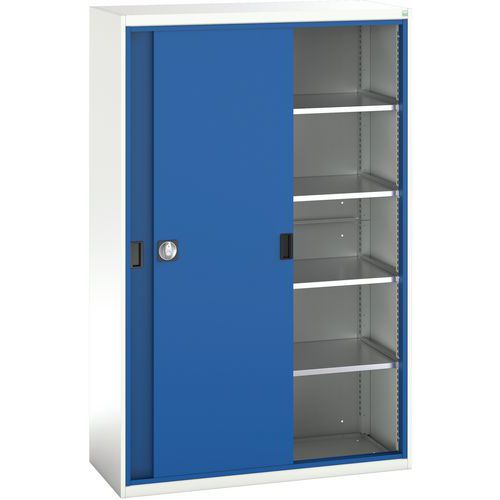 Verso garderob med skjutdörrar. Med 4 hyllplan. 1300x550x2000. Skåpet låses med nyckel. Gjord i UK Maximal last (kg) : 1000 Maximal vikt per hyllplan (kg) : 75