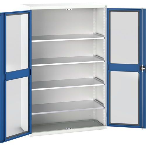 Verso skåp med transparenta dörrar. Med 4 hyllplan. 1300x550x2000. Gjord i UK Maximal vikt per hyllplan (kg) : 75 Maximal last (kg) : 1000