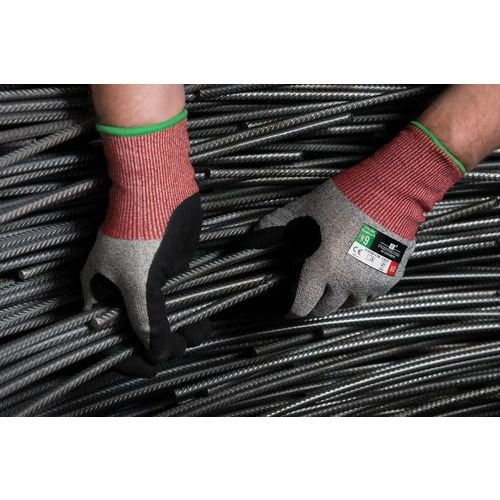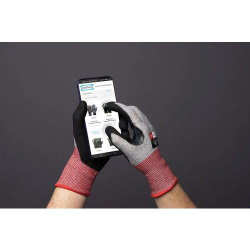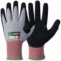Skärskyddshandskar med sandaktig nitrilbeläggning och touch screen-kompatibilitet, erbjuder högsta säkerhet och funktionalitet för moderna arbetsmiljöer.