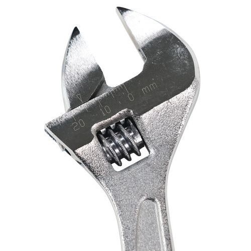 - Justerbar skiftnyckel i kromvanadinstål med smalt huvud vinklat 15°. Käkspärrsystemet sticker inte ut.