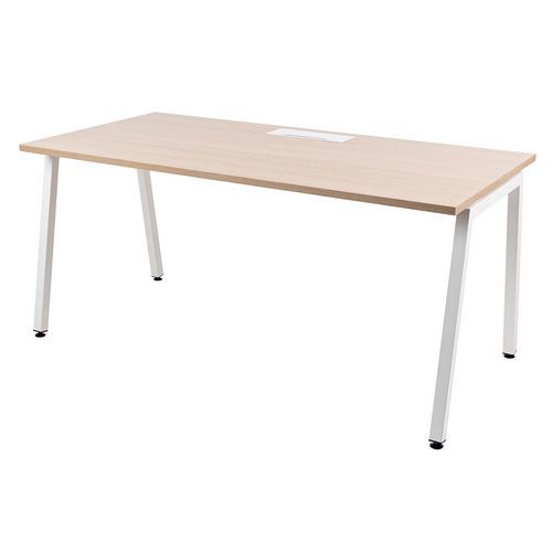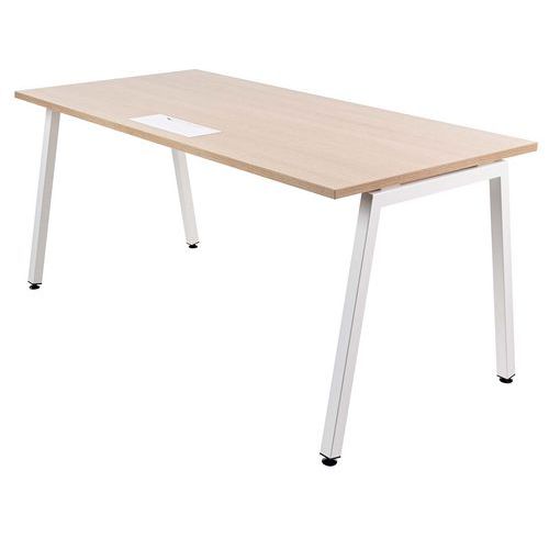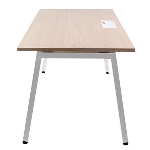 Rakt skrivbord med välvda (A-formade) ben. Melaminbänkskivan är 25 mm tjock med en 2 mm ABS-kant. 10 mm mellan fötterna och skrivbordet. Två metallbärande tvärstycken (40x20 mm). Metallrörsben (40x40 mm) och plastutjämningsfötter (+10 mm). Bänkskiva levereras med ett kabelhanteringssystem med lock.