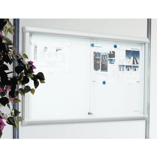 - Ram i anodiserat aluminium. Skyltskåp för inomhusbruk med skjutdörrar i säkerhetsglas på 4 mm och cylinderlås.