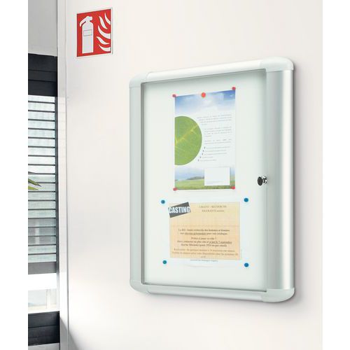 - Skyltskåp med ram i anodiserad aluminium. Sidohängd dörr med låsbar glasruta och lås framtill. Magnetiskt bakstycke.