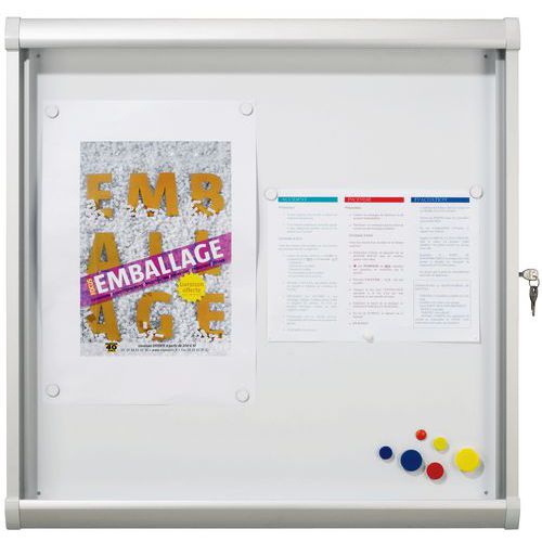 Kork- eller magnetisk whiteboardbotten (emalj). Ram i natureloxerad aluminium. 4 mm säkerhetsglas. Höger/vänsterhängd väljs vid uppsättning (skruv medföljer). Nyckellåsning.