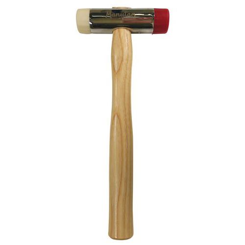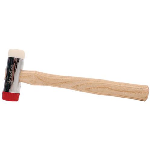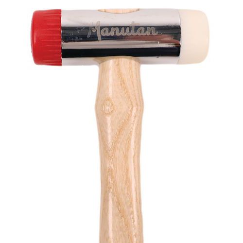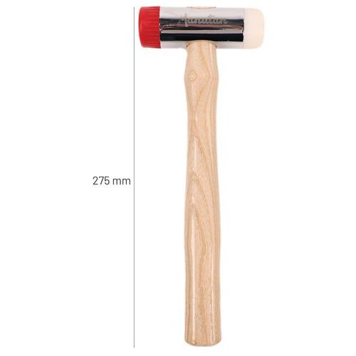 Slägga med utbytbara huvuden. Stålhuvud med kromfinish. Skaft av askträ. Huvudena lämnar inga märken på ytorna de träffar. Levereras med två gummi- och lövträhuvuden.