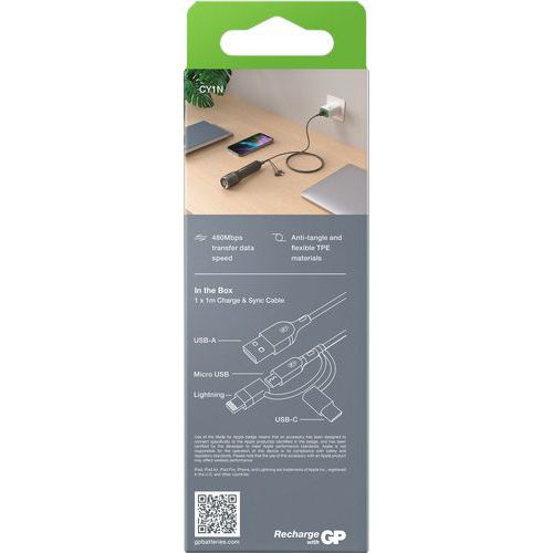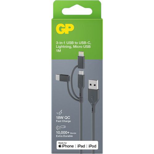 | Varunamn | Slitstark 1-meters 3-i-1-USB-kabel, 18 W, USB-anslutningstyp: USB-A USB-C 3.1 Lightning Micro USB, Längd: 1 m |