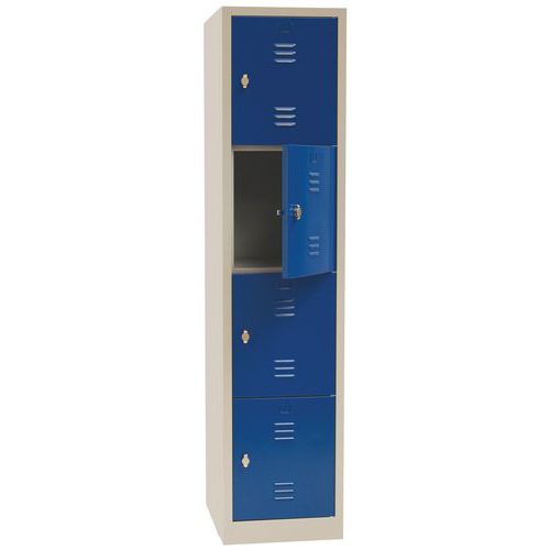 Dörrar som förstärkts med osynliga gångjärn. Ventilation upp- och nedtill på framsidan. Hål för väggmontering. Levereras monterat och utan lås. Beställ cylinderlås med två nycklar eller klinka för hänglås (hänglås ingår ej).