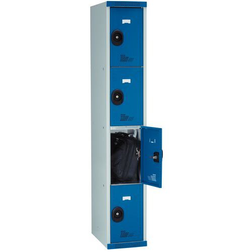 Inbrottssäkert: bakkantssäkrade dörrar och förstärkt konstruktion. 120⁰ öppning. Ingen åtkomst mellan över- och underfack. Fyra monteringshål för montering av flera skåp i rad. Hygien: ventilationsöppningar upp- och nedtill på dörrarna, samt i skåpets botten. Klädskåp med etiketthållare.