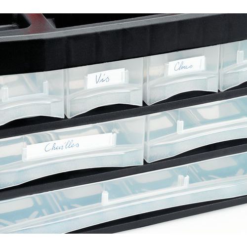 - Placera avdelarna på önskat sätt och skapa tydlig ordning för dina saker. Transparenta lådor med etiketthållare.