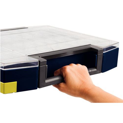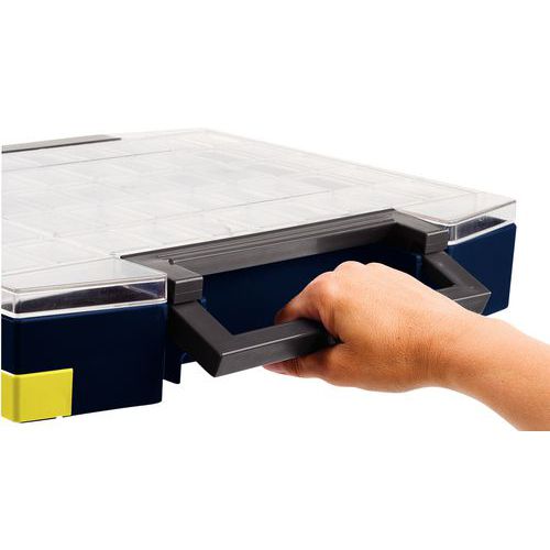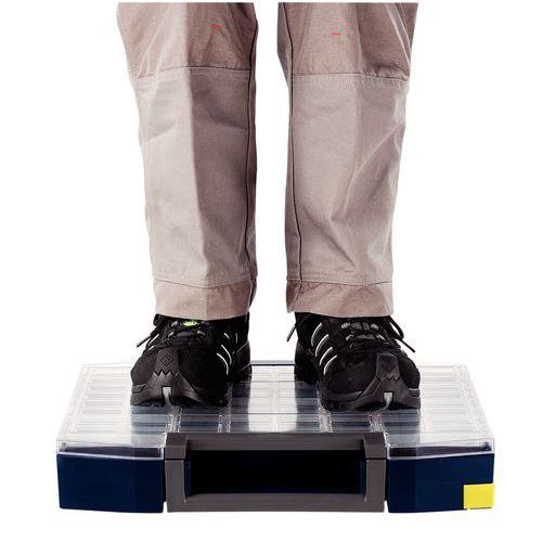 - Gångjärnen skyddas av lådväskans dubbla skal.