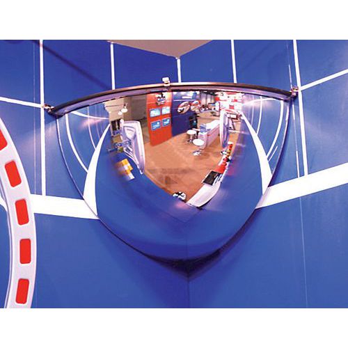 - Konvex spegel för diskret upphängning i hörn. Liten modell med möjlighet att se i två riktningar. Perfekt för övervakning i mindre verksamheter, för att förhindra stöld och skadegörelse.