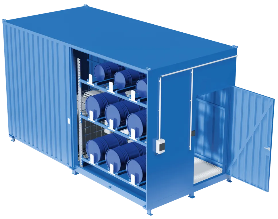 Anpassad för fat eller pallgodsEn kompakt lösning för lagring av fat, fat på pall eller gods på pall.