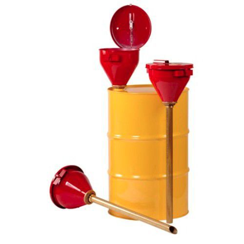 - Stor ståltratt med självslutande lock och 813 mm långt flamskydd för användning med brandfarliga vätskor.