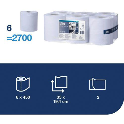 | Varunamn | Torkduk i centrummatad rulle, Färg: Blå, Typ: Pappersrulle, Lager: 2, Antal format/rulle: 450 |