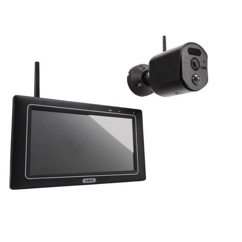 Trådlöst övervakningskit med kamera och bärbar pekskärmsmonitor.