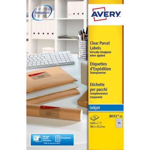 | Varunamn | Transparent minietikett 38,1x21,2 mm, Antal etiketter/ark: 65, Antal etiketter: 1625, Etikett, längd: 38.1 mm |