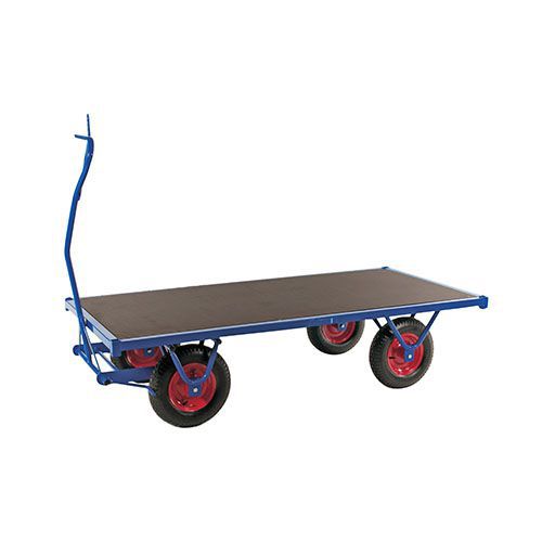 Flakvagn i mycket kraftig konstruktion. Med hjälp av handtaget så bromsar man enkelt vagnen. Pulverlackerad med lastplan av plywood. Svetsad rörram. Med parkeringsbroms och draghandtag. Ögla: 24 mm, diameter. Luftgummihjul med plåtfälg.
