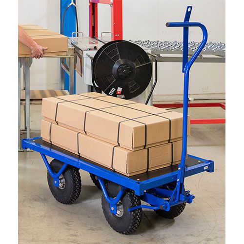 Flakvagn i mycket kraftig konstruktion. Med hjälp av handtaget så bromsar man enkelt vagnen. Pulverlackerad med lastplan av plywood. Svetsad rörram. Med parkeringsbroms och draghandtag. Ögla: 24 mm, diameter. Luftgummihjul med plåtfälg. Kapacitet (kg) : 800