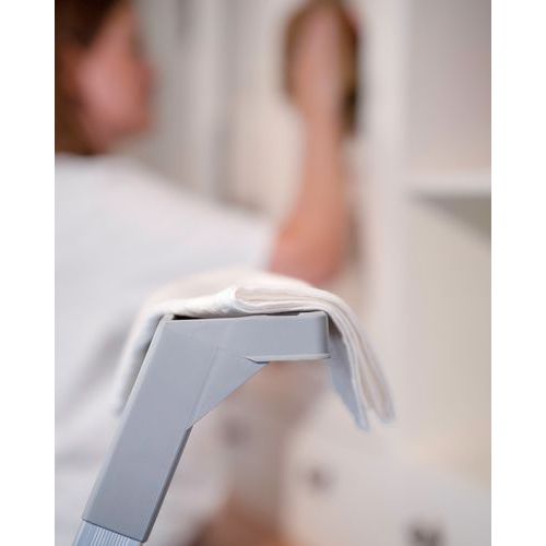 Stegen har monterad verktygshylla i plast som underlättar arbetet.