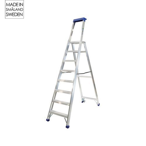 Trappstege 3350 - en robust trappstege tillverkad i aluminium, perfekt för krävande arbetsmiljöer. Stegen har hydraulnitade steg och en stabil plattform för extra säkerhet. Den är utrustad med en plastverktygshylla och plastfötter för glidskydd och skydd av underlaget. Modellen har hjul på bakre benparet för enkel förflyttning. Tillbehör som stegbreddare och handledare finns tillgängliga, och samtliga stegar är godkända enligt AFS 2004:3 och EN-131. Trappstege 3350 med 3-, 4- och 5-steg uppfyller kraven i Bra arbetsmiljöval. Vad innebär Bra Arbetsmiljöval? Bra Arbetsmiljöval är ett certifikat, framtaget av Riksbyggarnas säkerhetsgrupp i Sverige, för att skapa säkrare stegprodukter som uppfyller en högt ställd kravspecifikation.