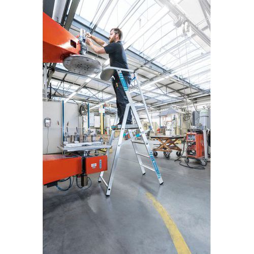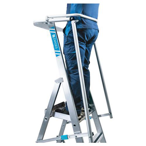 Plattformsstege ZAP Safemaster S - Säker upp- och nedstigning och hög säkerhet tack vare 80 mm halksäkra steg med Zarges Safer Step-teknologi samt eloxerade handledare och 1 meter höga skyddsräcken.