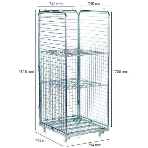 | Varunamn | Rullcontainer tresidig, Kapacitet: 400 kg, Total höjd: 1815 mm, Längd totalt: 794 mm, Antal sidor: 3 |