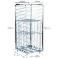 | Varunamn | Rullcontainer tresidig, Kapacitet: 400 kg, Total höjd: 1815 mm, Längd totalt: 794 mm, Antal sidor: 3 |